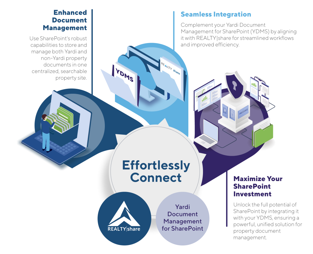 Enhance your Yardi Document Management for SharePoint (YDMS) by integrating directly with REALTY|share, enabling seamless document storage and management across your property portfolio. Save your Yardi documents as well as your non-Yardi documents on a single SharePoint site.